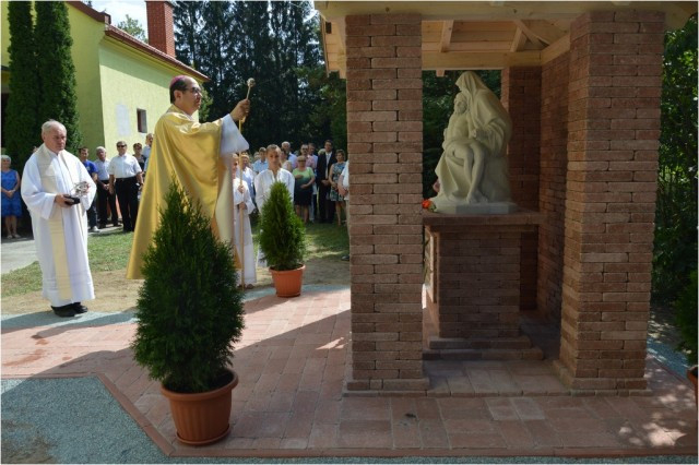 települések plébánosa, aki meggyilkolt káplánja emlékére Piéta-szobrot