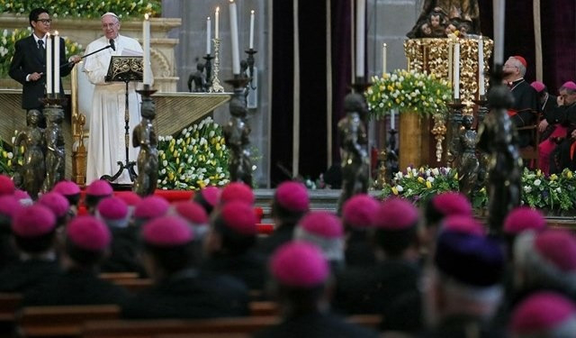 Ferenc pápa utalt arra, hogy ismeri a püspökök népének fájdalmas történetét, melyről szent elődje, II. János Pál itt, Mexikóban mondta, hogy „titokzatos és bőséges folyam alkotja azt: őslakos népeinek ősi és gazdag érzékenysége, a lelkükben gyökeret vert kereszténység és a modern európai racionalitás”. Ebben a történelemben az anyai öl folyamatosan megszülte Mexikót. Ezért mindig ebből az anyai ölből induljon ki a népetek lelkülete, mert az a keresztény hit öle, mely képes a kiengesztelődésre a magány, az elszigetelődés és a peremre szorultság által megjelölt múlttal.