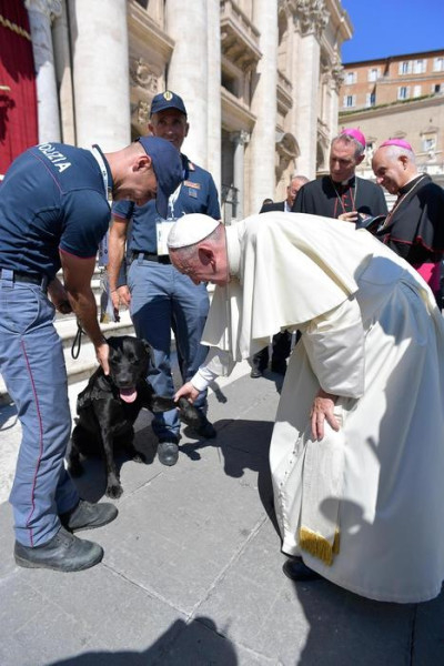 Ferenc pápa és egy a földrengés áldozatait mentő kutyák közül