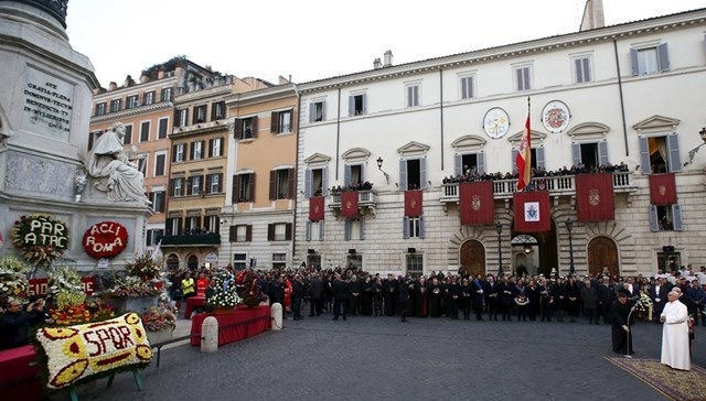 Beszéde elején Ferenc pápa bocsánatot kért, hogy szokásától eltérően nem állva beszél, mert napok óta tartó influenzás megbetegedése miatt nem érzi magát elég erősnek.