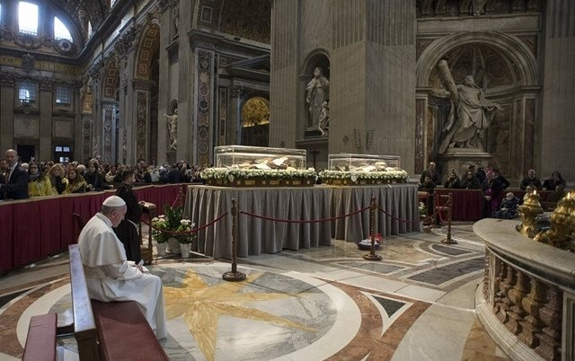 A Szentatya Pietrelcinai Szent Pio és Szent Leopold Mandić földi maradványai közelében, a bazilika látogatók elől elzárt részében foglalt helyet, miközben a zarándokok imádkozva, lassan elhaladtak a Szent Péter-oltár elé helyezett két koporsó előtt.