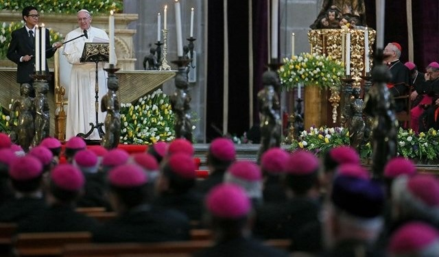 Mexikói útjának első napján, február 13-án Ferenc pápa az ország püspökeivel is találkozott, beszédet intézett hozzájuk a mexikóvárosi székesegyházban.