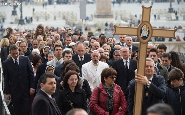 A VI. Pál teremben reggel kezdődő ünnepség után Ferenc pápa maga is az alkalmazottakhoz csatlakozva vonult a Szent Péter téren át a bazilikába.