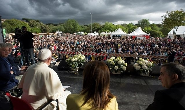A Villa Borghesében, Róma egyik hatalmas, píneafenyőkkel teli parkjában Ferenc pápa váratlan, programon kívüli látogatást tett vasárnap. Délután öt órakor a Borghese park ügetőpályáján több ezer fiatal várta, többek között a Fokoláré Gen Verde együttesének muzsikáját hallgatva.