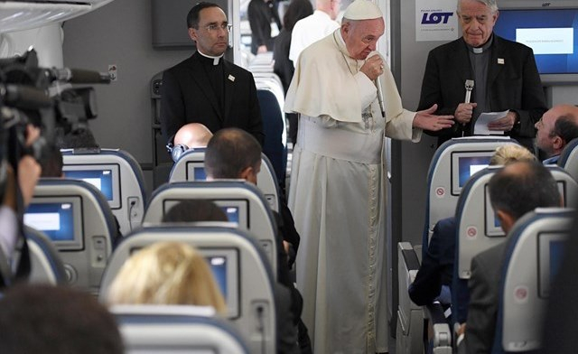 Érintett témák: Milyennek látta Lengyelországot? A fiatalok nyelvezetét, nehézségeit ismerő beszédek. Miért nem emeli fel a hangját a török puccsot követő tisztogatás miatt? Pedofíliavád Pell bíborossal szemben. Közvetít a Vatikán Venezuela ügyében? Miért erőszakról, miért nem iszlám erőszakról beszél? Az első terrorizmust a pénzimádat jelenti. Elmegy-e 2019-ben Panamavárosba?
