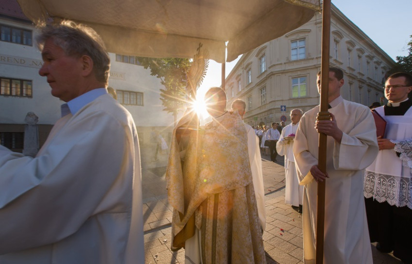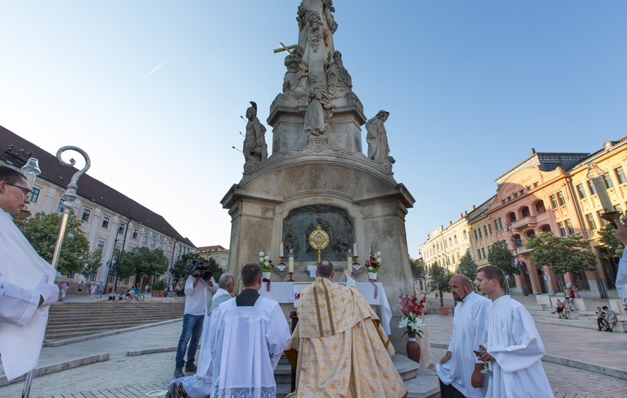 A szentmisét körmenet zárta Szombathelyen, amely a székesegyházból indulva érintette a Fő teret. A négy sátornál a főpásztor áldást osztott az Oltáriszentséggel.